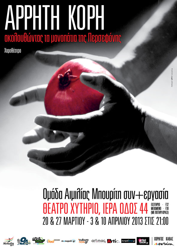 Η ομάδα Αιμιλίας Μπουρίτη συν+εργασία παρουσιάζει από την Τετάρτη 20 Μαρτίου, και κάθε Τετάρτη μέχρι τις 10 Απριλίου, στο θέατρο Χυτήριο τη χοροθεατρική παράσταση «Άρρητη Κόρη – Ακολουθώντας τα μονοπάτια της Περσεφόνης». Η παράσταση εστιάζει στους μύθους της Περσεφόνης, στο ταξίδι της από τα Ηλύσια πεδία, στο μυθικό τόπο της Ελευσίνας, στον σκοτεινό και ασυνείδητο Άδη, στο ρόδι, το συνδετικό στοιχείο των δύο κόσμων, στο βιασμό της Κόρης και στο Διόνυσο Ζαγρέα. Τα στοιχεία αυτά συνομιλούν με την ανάγκη των καλλιτεχνών αλλά και των θεατών για μία βαθιά ψυχική εμπειρία κάθαρσης.