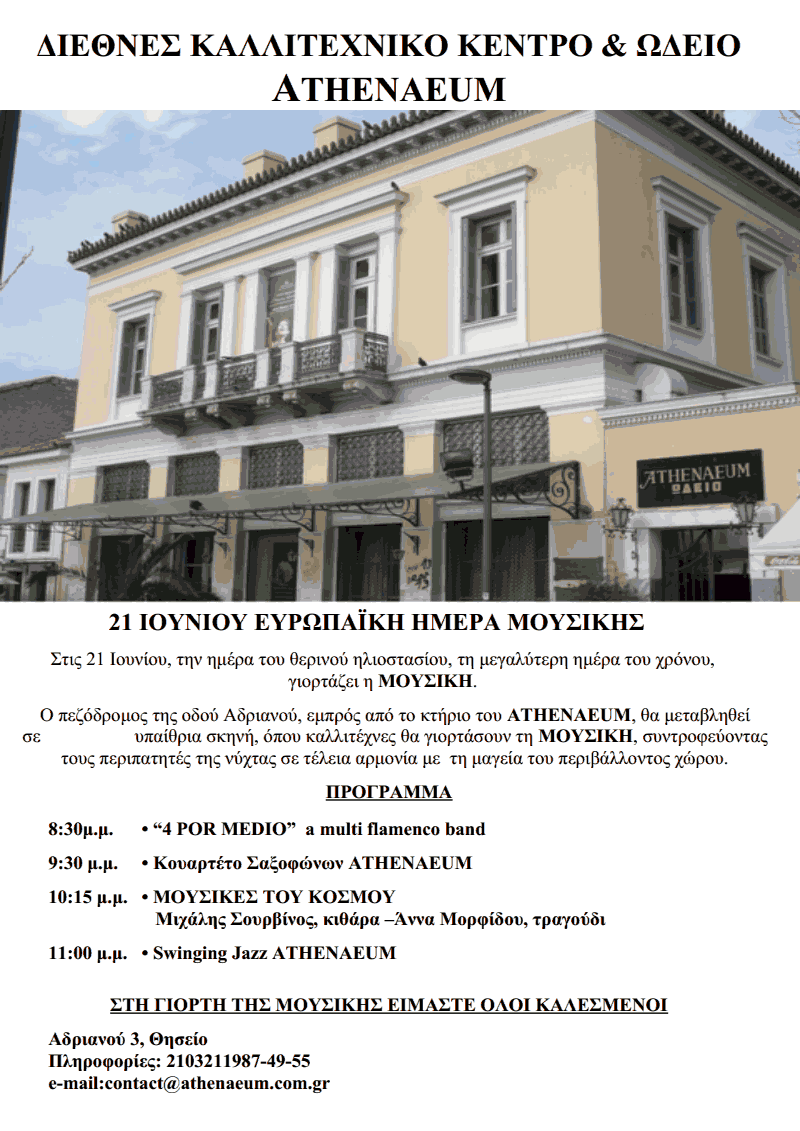 Έτσι, την Παρασκευή 21 Ιουνίου 2013, από τις 20:30 έως τις 24:00, το ATHENAEUM μεταμορφώνει τον πεζόδρομο της οδού Αδριανού, εμπρός από το κτήριο του, σε υπαίθρια σκηνή, όπου νεώτεροι και καταξιωμένοι καλλιτέχνες – συνεργάτες του, με μία τετράωρη γιορτή αφιερωμένη στη ΜΟΥΣΙΚΗ θα συντροφεύσουν τους περιπατητές της νύχτας σε τέλεια αρμονία με τη μαγεία του περιβάλλοντος χώρου.