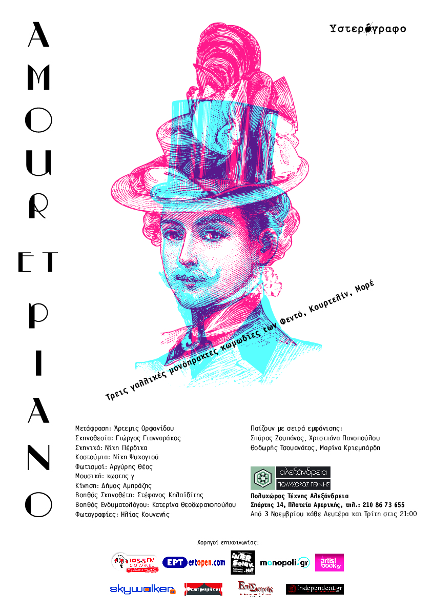 Παρίσι, αρχές του 20ού αιώνα. Κωμωδία με άρωμα μπελ επόκ. Τρεις συγγραφείς, μάστορες του είδους: Φεντό, Κουρτελίν, Μορέ. Και μια παράσταση τριών μονόπρακτων, που υπό τον γενικό τίτλο «Amour et piano» (Έρωτας και πιάνο), ανεβαίνει τη Δευτέρα 3 Νοεμβρίου 2014 από την ομάδα «Υστερόγραφο», στον πολυχώρο «Αλεξάνδρεια», στην οδό Σπάρτης 14, Πλατεία Αμερικής, τηλ. 210-8673.655.