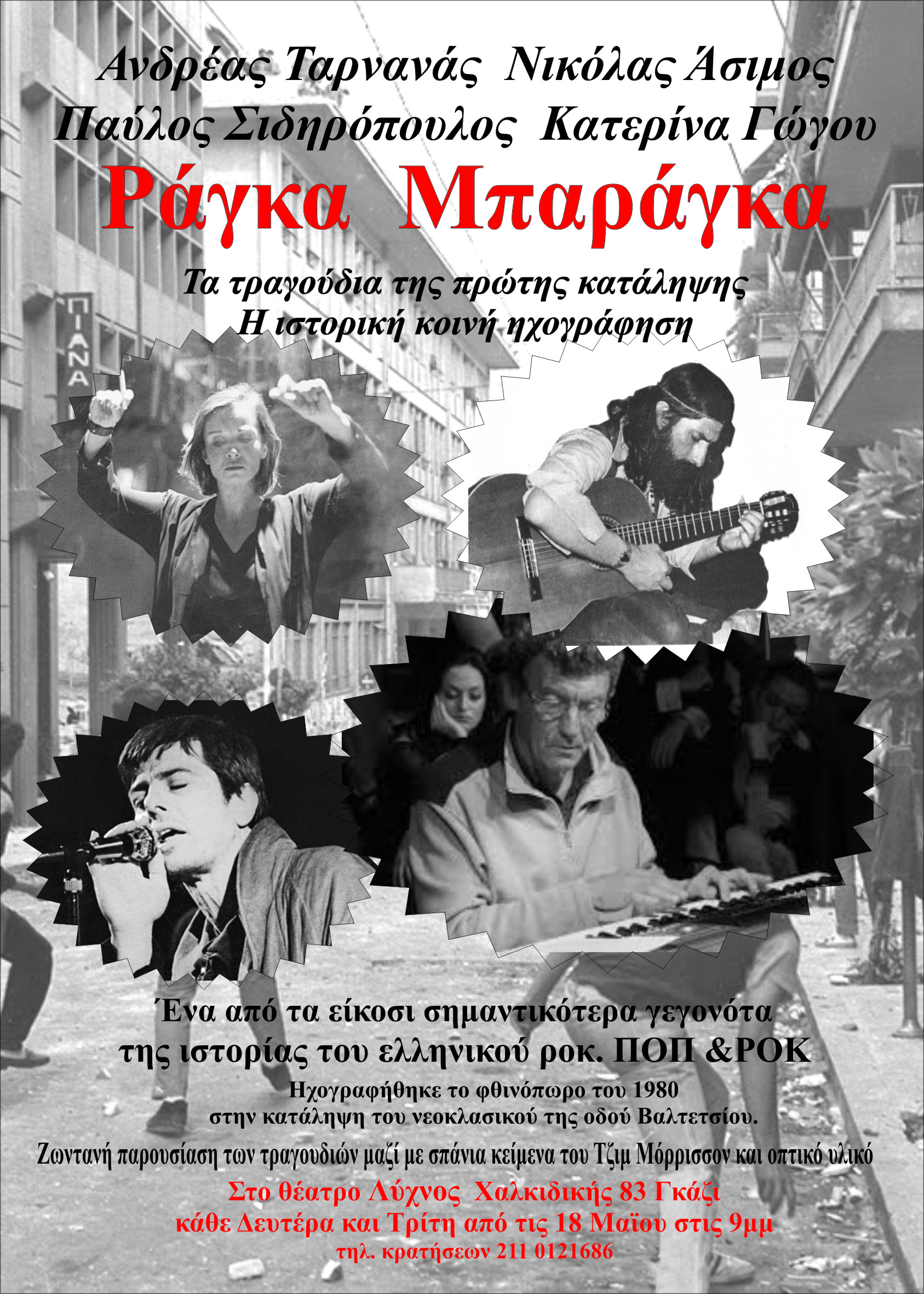 Γράφει ο Ανδρέας Ταρνανάς: « Όλο το καλοκαίρι του ’80 πέρασε με διαδηλώσεις και καταλήψεις των πανεπιστημίων καθώς οι φοιτητές αντιστέκονταν στο νόμο 815 που ήθελε να εκσυγχρονίσει τις σπουδές. Στην κατάληψη της Νομικής αντηχεί η φωνή του Σαββόπουλου που μιλά για τον Δεκέμβρη του ’44 μέσα από τις στροφές της «Ρεζέρβας», ενώ στις γειτονιές οι εργάτες στηρίζουν τις ελπίδες τους στην “αλλαγή” που υπόσχεται μια νέα και γρήγορα ανερχόμενη πολιτική παράταξη. Στα Εξάρχεια όλα έχουν ένα χαρακτήρα ιλαροτραγωδίας που τον τονίζει η καινοφανής γιορτή του Πολυτεχνείου. Το φθινόπωρο, προστίθεται στο εύφλεκτο κλίμα των ημερών η κατάληψη ενός διώροφου νεοκλασικού στην οδό Βαλτετσίου. Διάφοροι παραδοξολόγοι βγαίνουν κάθε τόσο στο μπαλκόνι και απευθύνουν ακατανόητα διαγγέλματα προς τους περαστικούς, ενώ οι λιγότερο ρητορικοί κάνουμε τις πρακτικές δουλειές στη είσοδο. «Ρε μπαγάσα περνάς καλά εκεί πάνω» λέω σ’ ένα φίλο που αγορεύει πάνω από το κεφάλι μας. «Κάνε πάσα και μια ματιά εδώ χάμω» συμπληρώνει αστραπιαία ο Άσιμος, κάτι που δεν ξέρω αν το είχε ήδη γραμμένο ή το επινόησε εκείνη την ώρα απαντώντας στην παρατήρηση μου σαν τους παλιούς κομφερανσιέ. Στη διάρκεια των επιδιορθώσεων του ερειπωμένου κτιρίου αρχίζει να κυκλοφορεί το σύνθημα «Ράγκα μπαράγκα» που χαρακτηρίζει απόλυτα τη διάθεση όλων που έχουμε ενδυθεί ένα προσωπείο πρόσφυγα πολυτελείας και που το αντλήσαμε από τον τίτλο ενός ποιήματος του Εμπειρίκου. Θέλοντας να δώσουμε ένα χαρακτήρα προβολής της ανεξάρτητης τέχνης, αποφασίζουμε να ηχογραφήσουμε δικά μας τραγούδια, για να παίζονται από τα μεγάφωνα που έχουν στερεωθεί στην πρόσοψη του κτηρίου. Το σχέδιο της μουσικής αυτάρκειας φάνηκε να ναυαγεί. Την άλλη μέρα όμως εισέβαλε η Γώγου κρατώντας ένα μαγνητόφωνο nagra που το χρησιμοποιούσαν τότε πολύ στον κινηματογράφο και μας υποχρέωσε να πούμε ο καθένας τα ολοκληρωμένα τραγούδια του. Τα δικά μου είχαν μελωδία, αλλά όχι οργανική συνοδεία καθώς το αρμόνιό μου ήταν δύσκολο να μεταφερθεί. Το ρόλο του συνοδού ανέλαβε τότε ο Παύλος (Σιδηρόπουλος), που δεν ξέρω πως είχε βρεθεί εκεί, καθώς δεν τον έλκυαν ιδιαίτερα τα Εξάρχεια, πιάνοντας στη στιγμή τα ακόρντα τους με μια ξένη κιθάρα.