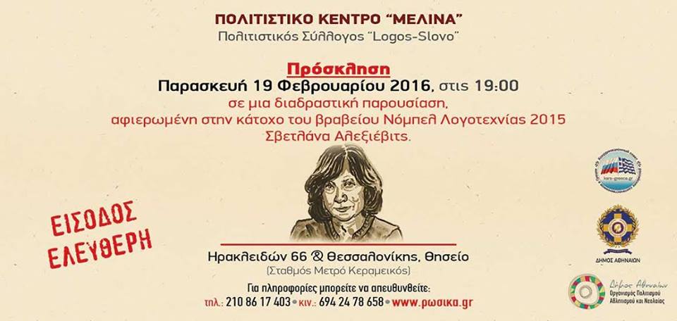 λογοτεχνική βραδιά στα ελληνικά με θέμα τα έργα της Σβετλάνας Αλεξιέβιτς και την πορεία προς το βραβείο Νόμπελ – Λογοτεχνίας.