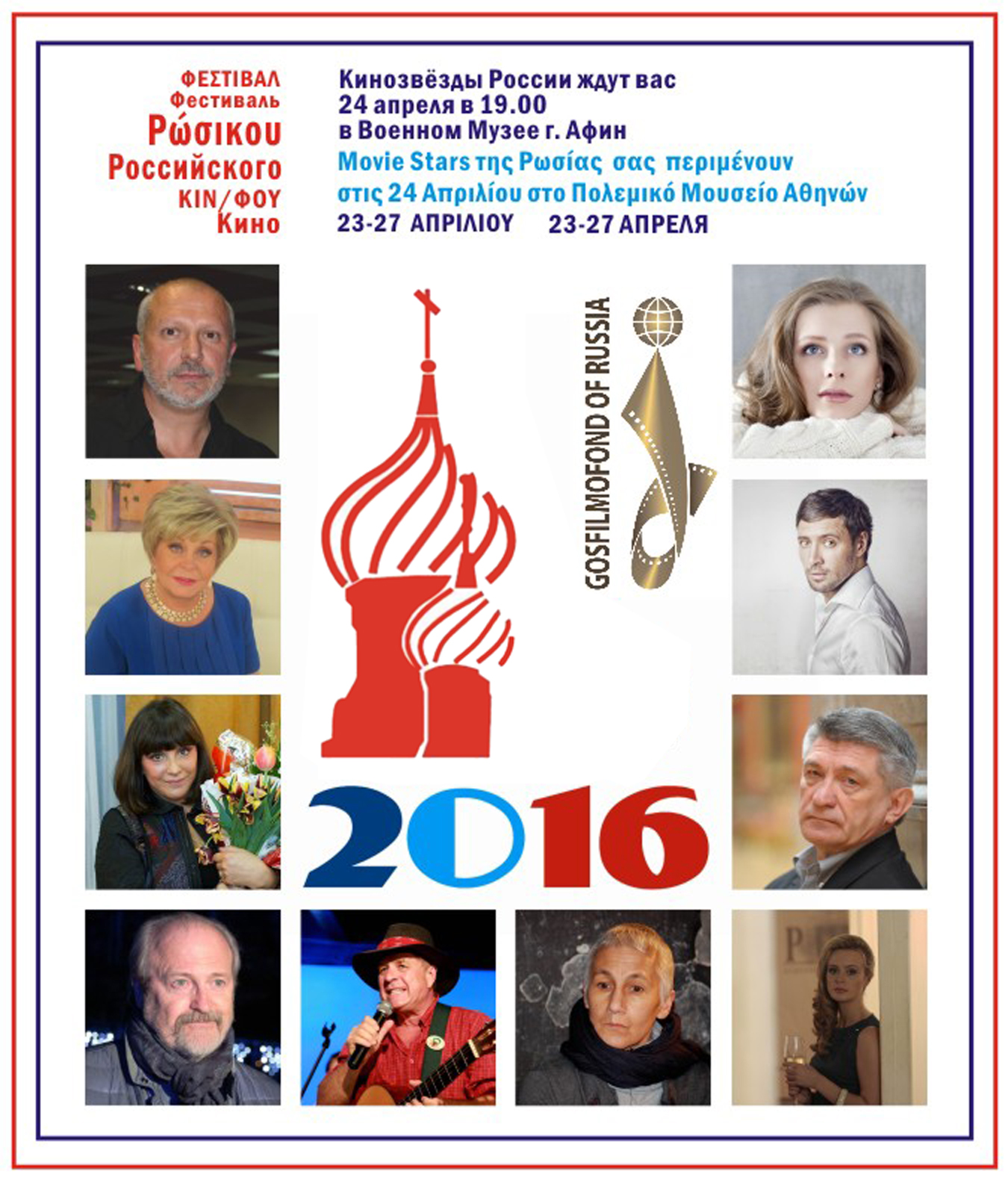 Στα πλαίσια του Έτους 2016- Σταυροδρόμι δυο χωρών ΕΛΛΑΔΑΣ – ΡΩΣΙΑΣ, ο Πρόεδρος της Ταινιοθηκης Gosfilmofond της Ρωσίας Νικολάι Μποροντοτσιόβ και ο Ξενοφών Λαμπράκης -πρόεδρος του Ελληνο- Ευρασιατικού Συνδέσμου οργανώνουν στην Ελλάδα (ΑΘΗΝΑ – ΛΑΜΙΑ- ΘΕΣΣΑΛΟΝΙΚΗ – ΚΑΤΕΡΙΝΗ) ΦΕΣΤΙΒΑΛ ΡΩΣΙΚΟΥ ΚΙΝΗΜΑΤΟΓΡΑΦΟΥ 23 – 27 ΑΠΡΙΛΙΟΥ 2016.