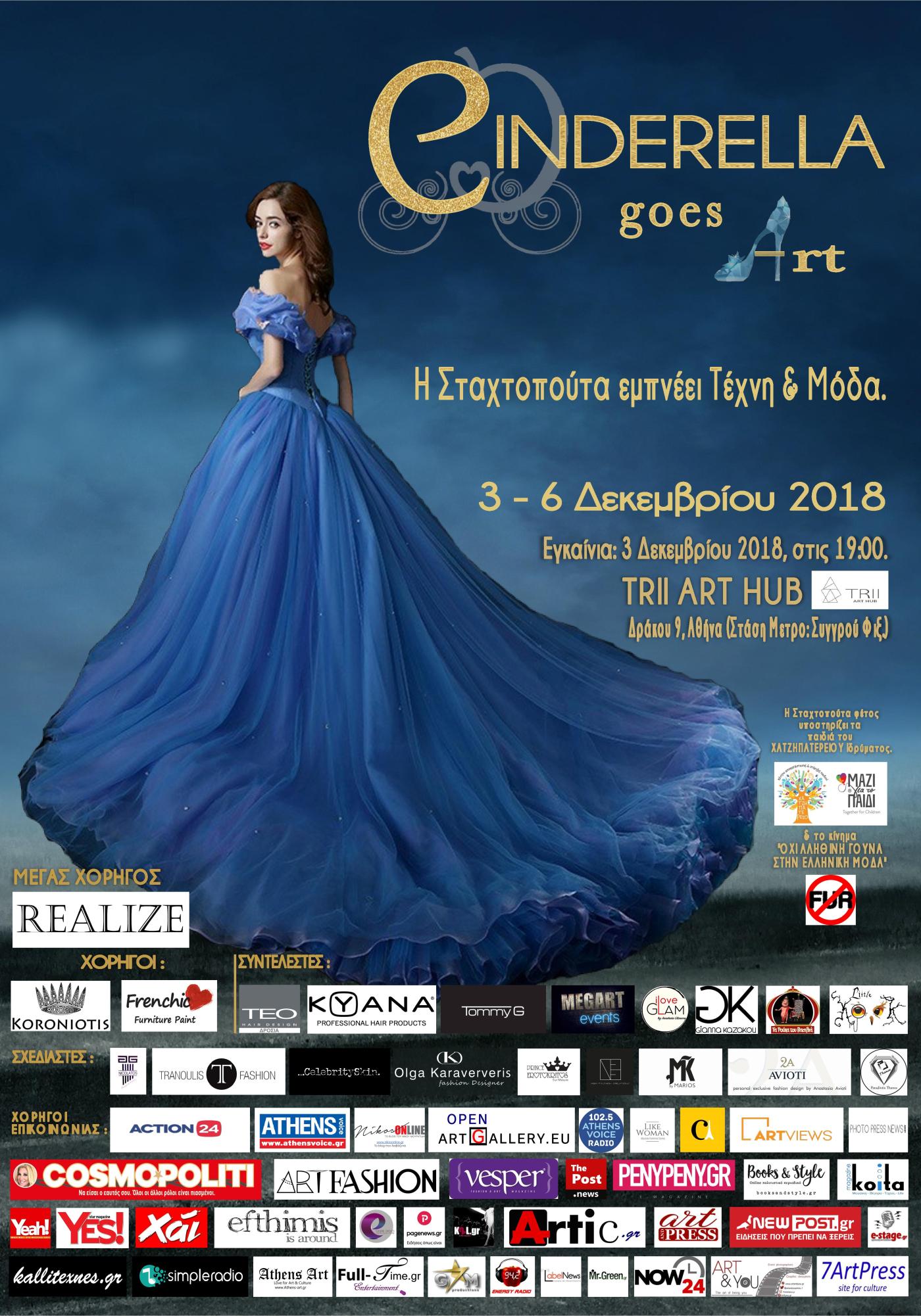 Ένα γυάλινο γοβάκι θα γίνει η αιτία ώστε η Σταχτοπούτα να βρει τον Πρίγκιπά της στο εικαστικό δρώμενο Τέχνης & Μόδας ‘’CINDERELLA GOES ART’’ ! Σε έναν κόσμο παραμυθένιο θα ταξιδέψουν όσοι παραβρεθούν στην καλλιτεχνική εκδήλωση με θέμα το παραμύθι των αδελφών Γκρίμ ‘’Σταχτοπούτα’’ στις 3-4-5-6 Δεκεμβρίου 2018. Το artistic project ‘’Cinderella goes Art’’ υποστηρίζει τα παιδιά με πολυαναπηρία του Χατζηπατέρειου Ιδρύματος. Στον νεοκλασικό πολυτελή χώρο του Trii Art Hub στην Αθήνα, θα πραγματοποιηθεί το δρώμενο που θα περιλαμβάνει εικαστική έκθεση, επιδείξεις γνωστών σχεδιαστών μόδας με βραδινά ενδύματα, προσφορά δώρων για τα παιδιά με ειδικές ανάγκες, κλασσικό χορό, cocktail party & εκπλήξεις !