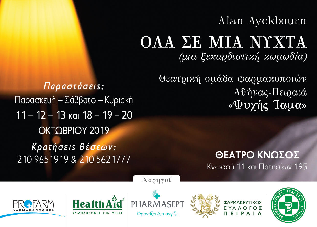 Η Θεατρική Ομάδα Φαρμακοποιών Αθήνας – Πειραιά «ΨΥΧΗΣ ΙΑΜΑ» συμπληρώνει φέτος δέκα χρόνια δραστηριοτήτων και το γιορτάζει με την παρουσίαση της «πιο ξεκαρδιστικής κωμωδίας» του γνωστού σύγχρονου Άγγλου θεατρικού συγγραφέα Alan Ayckbourn «Όλα σε μια νύχτα» (διασκευή – μετάφραση: Γιώργος Κιμούλης). Για τις ανάγκες της παράστασης, η Ομάδα «μετακομίζει» και πάλι στο Θέατρο «Κνωσός» (Κνωσού 11 και Πατησίων 195, Πατήσια, τηλ. 210 8677070), όπου αναμένεται να λάβει ακόμα μεγαλύτερη απήχηση και αγάπη από το φιλοθεάμων κοινό. Η κωμωδία του Alan Ayckbourn “Όλα σε μια νύχτα ” θα παρουσιαστεί, κατ’ αρχήν, στο Θέατρο «Κνωσός» για 6 παραστάσεις, Παρασκευή, Σάββατο και Κυριακή 11, 12, 13 και 18, 19, 20 Οκτωβρίου 2019 με ώρα έναρξης τις 21.00.