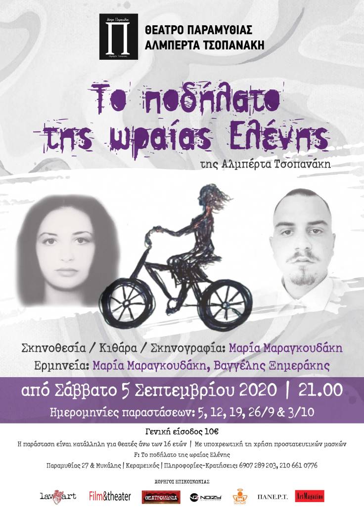 «Ένα ταξίδι ανατροπών που ακροβατεί ανάμεσα στο φανταστικό και το πραγματικό.Το ποδήλατο της ωραίας Ελένης μας ταξιδεύει στον κόσμο των θρίλερ,με φόνους…στυγερά εγκλήματα…μυστήρια…έρωτα…σασπένς.Στην προσπάθεια του το κοινό να ανακαλύψει τον δολοφόνο θα εκπλαγεί από το απρόβλεπτο φινάλε της ωραίας Ελένης.