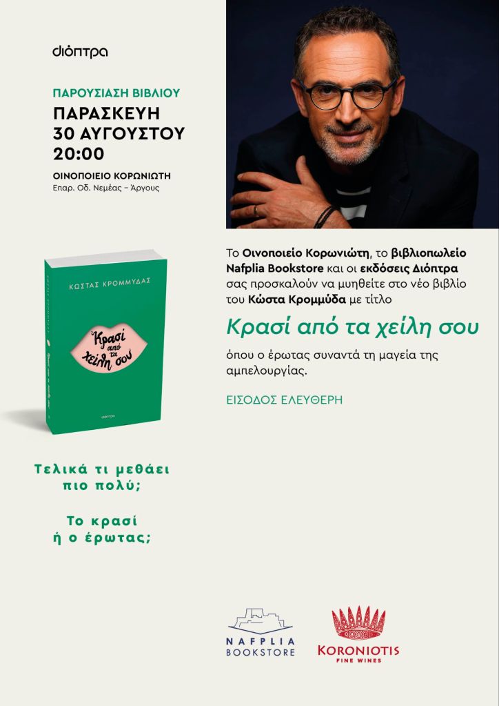 Στο πλαίσιο του εορτασμού «ΜΕΓΑΛΕΣ ΜΕΡΕΣ ΝΕΜΕΑΣ – 2024» και με επίκεντρο το Αγιωργίτικο, η ΟΙΝΟΠΟΙΙΑ ΚΟΡΩΝΙΩΤΗ σε συνεργασία με τις εκδόσεις ΔΙΟΠΤΡΑ σας καλούν στην παρουσίαση του βιβλίου ΚΡΑΣΙ ΑΠΟ ΤΑ ΧΕΙΛΗ ΣΟΥ του συγγραφέα ΚΩΣΤΑ ΚΡΟΜΜΥΔΑ, που θα πραγματοποιηθεί την Παρασκευή 30 Αυγούστου και ώρα 20:00 στον χώρο του οινοποιείου Κορωνιώτη. Επαρ.Οδ. Νεμέας – Άργους, Πανόραμα 212 00