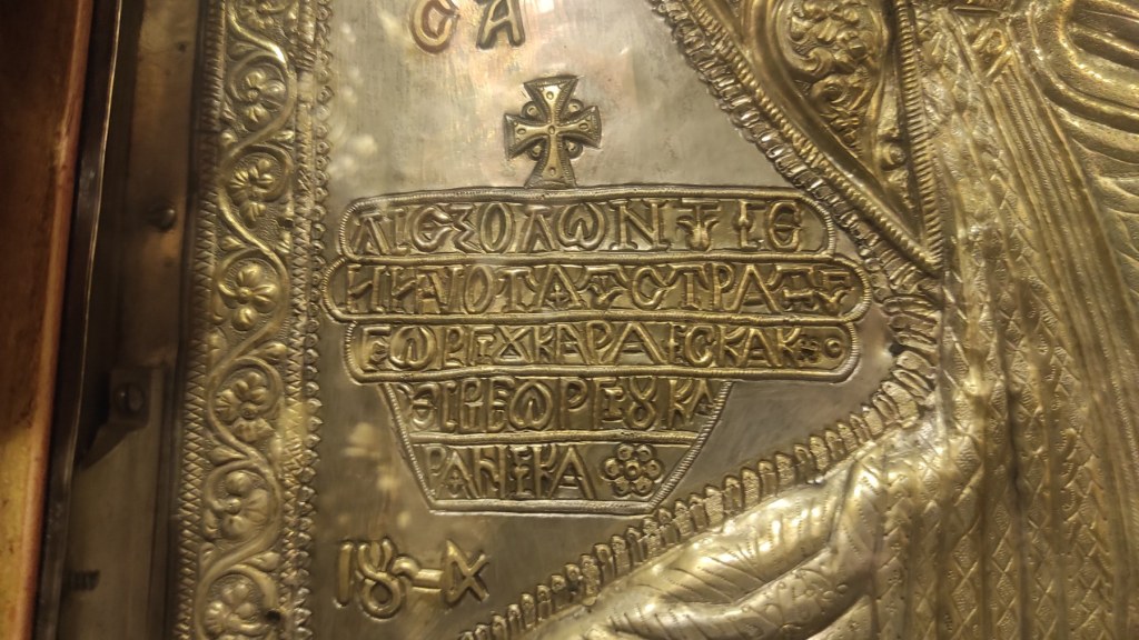 Στην δε εικόνα απάνω αναγράφεται το όνομα του Καραϊσκάκη, η ημερομηνία και το όνομα του τεχνητή Γεώργιος Καρανίκας που την φιλοτέχνησε.