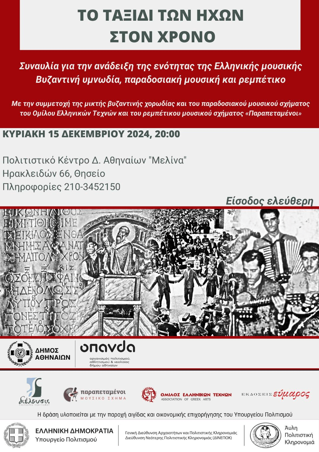 Ο Πολυχώρος Πολιτισμού Διέλευσις, το μουσικό σχήμα «Παραπεταμένοι», ο Όμιλος Ελληνικών Τεχνών, οι Εκδόσεις Εύμαρος και ο Οργανισμός Πολιτισμού, Αθλητισμού και Νεολαίας του Δ. Αθηναίων, σας προσκαλούν στην 2η συναυλία για την ενότητα της Ελληνικής μουσικής (Βυζαντινή/Ψαλτική μουσική, Παραδοσιακή μουσική και Ρεμπέτικο) με τίτλο «Το ταξίδι των ήχων στον χρόνο» την Κυριακή 15 Δεκεμβρίου 2024 στις 8 μμ. στο Πολιτιστικό Κέντρο Δήμου Αθηναίων «Μελίνα».