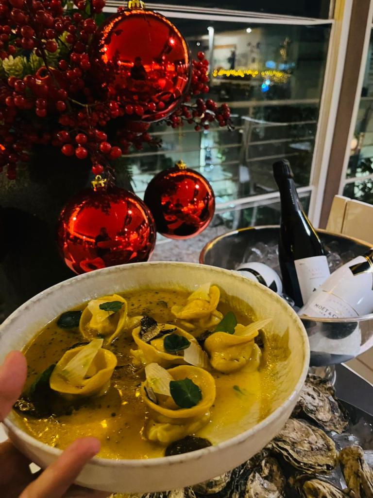 - Ζεστό ορεκτικό: Ραβιόλι αστακού με ζωμό κεφαλιού και μαύρη τρούφα