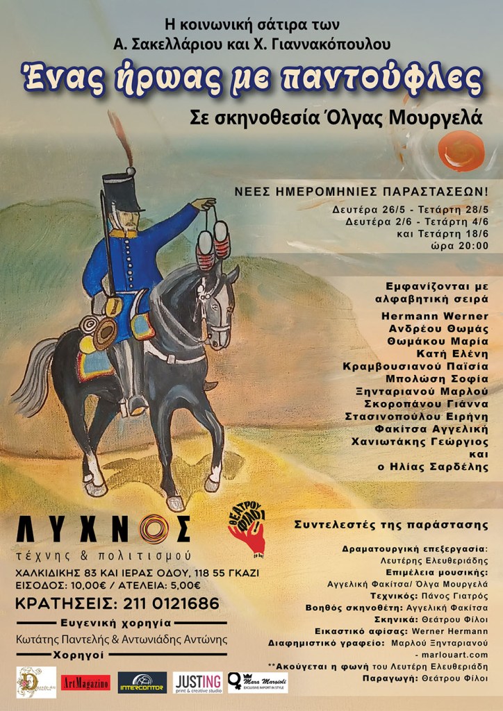 Το θεατρικό μας εργαστήρι “Θεάτρου Φίλοι”, με σπουδαίες επιτυχίες στο ενεργητικό του, έχει τη χαρά να παρουσιάσει στο απαιτητικό κοινό τη δραματική, σατυρική και κοινωνική κωμωδία “Ένας ήρωας με παντούφλες” των Α. Σακελλάριου και Χ. Γιαννακόπουλου.