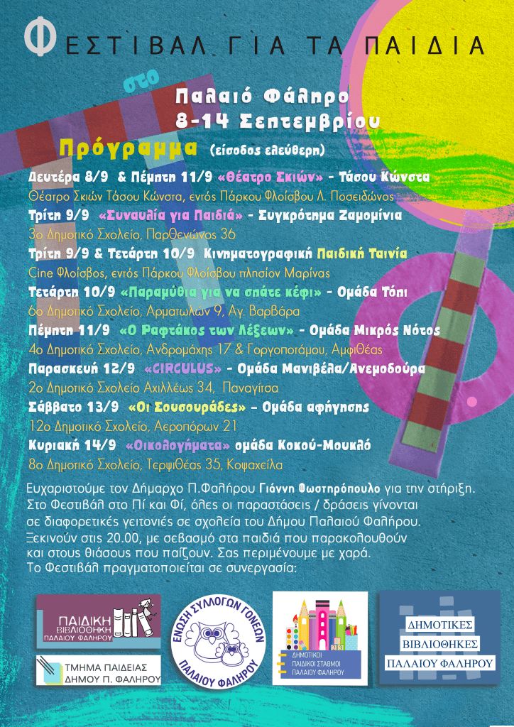 Ο Δήμος Παλαιού Φαλήρου, σε συνεργασία με την Π.Ε.Δ. Αττικής, παρουσιάζει το «Φεστιβάλ για τα Παιδιά – στο Πι και Φι», ένα γιορτινό πολιτιστικό γεγονός που φέρνει φως, χαρά και έμπνευση σε κάθε γειτονιά της πόλης.