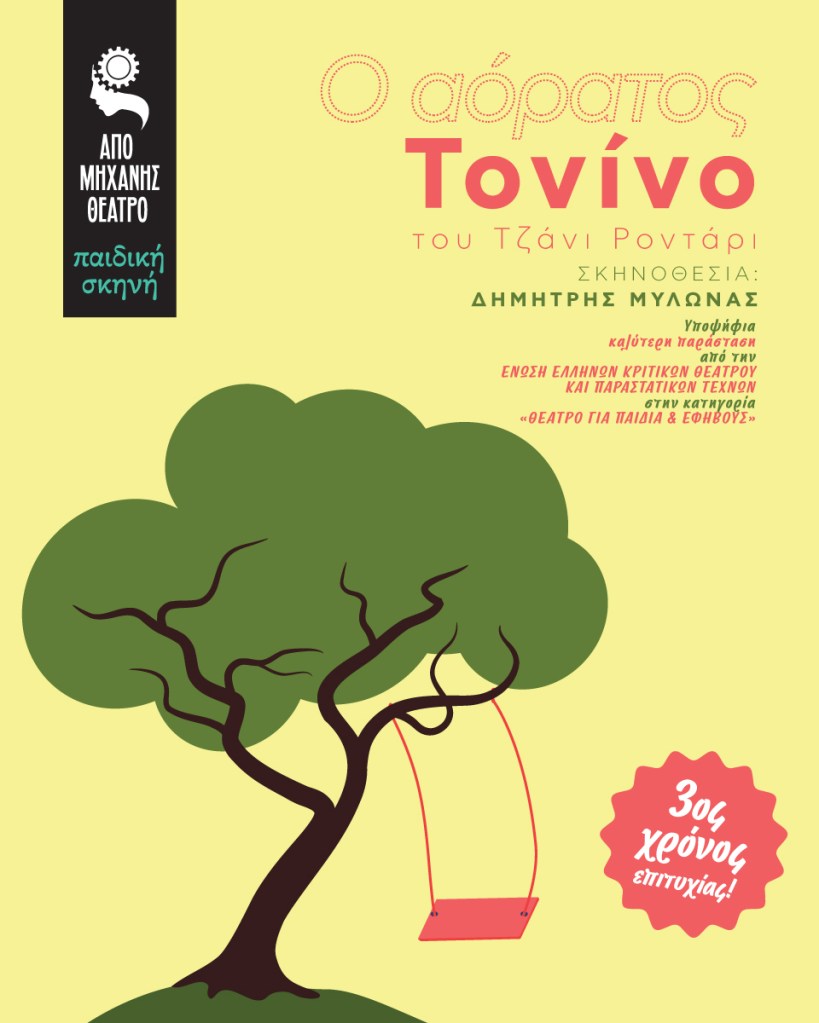 Μετά τη μεγάλη επιτυχία και τα sold-out που σημείωσε για 2 συνεχόμενες χρονιές, η ΠΑΙΔΙΚΗ ΣΚΗΝΗ του «Από Μηχανής» Θεάτρου παρουσιάζει για 3η χρονιά την παράσταση που αγαπήθηκε από μικρούς και μεγάλους «Ο αόρατος Τονίνο» βασισμένη στο ομότιτλο βιβλίο του Τζάνι Ροντάρι και σκηνοθεσία Δημήτρη Μυλωνά.