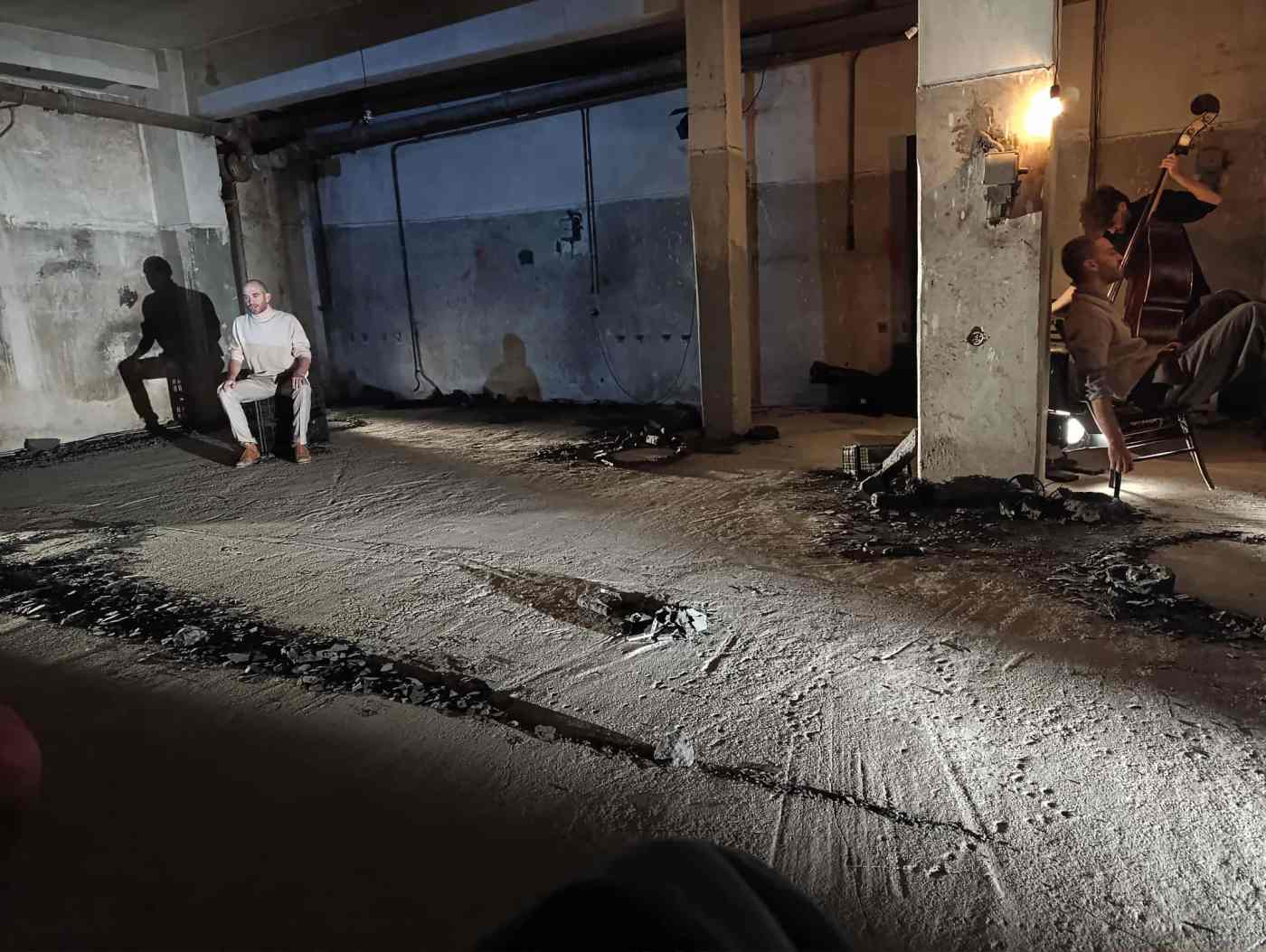 Καταρχήν το έργο αυτό ξεκίνησε από μία ιδέα..έχει να κάνει με το background το δικό μου αλλά και μιας συνάντησης ανθρώπων που έχουν τις ίδιες ιδέες, την ίδια αισθητική. Έχω κάνει παραστάσεις έχω δουλέψει και έχω ζήσει πολλά χρόνια στο εξωτερικό και το θέατρο εκεί έχει διαφορετική υπόσταση ( το θέατρο) πώς να σας το πω, το κείμενο γίνεται μια αφορμή για μία συνάντηση πολλών τεχνών μαζί. Για μένα αυτό που έχει συμβεί εδώ είναι space time δηλαδή αν το κάνω αλλού θα είναι κάτι διαφορετικό. Δουλεύουμε μαζί με το σκηνογράφο και όπως βλέπετε αυτό το σκηνικό έχει μία άλλη λογική έχει την λογική του installation. Ο Κορνήλιος Σελαμσής (ο μουσικός) είναι πολύ κοντά στη δική μου αισθητική και δουλεύουμε μαζί για την προσαρμογή στο συγκεκριμένο χώρο και πολύ πριν ακόμα από τις πρόβες. Είμαστε μία ομάδα που έχουμε συναντηθεί για τον ίδιο σκοπό. Εγώ έτσι αντιλαμβάνομαι το θέατρο. Υπάρχει ένα όραμα..υπάρχουν οι κοινοί τόποι. Έχω μία πολύ μεγάλη αγάπη στον Muller και δεν σας κρύβω ότι ξεκίνησε αυτή η παρουσίαση μου, αυτή η δουλειά μου από το bios αρκετό καιρό πριν κατά τη διάρκεια του κορωνοϊου.