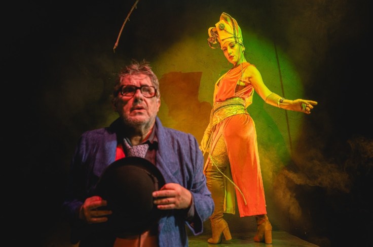 Η σκηνή γίνεται ένα θέατρο μέσα στο θέατρο, γεμάτο μπαούλα, βαλίτσες, ερείπια θεατρικών εποχών και φωτισμούς που δραπετεύουν από τον ρεαλισμό.