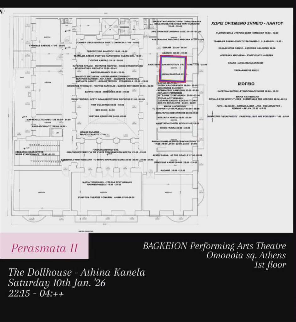 Στο πλαίσιο του ολονύχτιου φεστιβάλ PERASMATA II, παρουσιάζω τη νέα μου durational performance The Dollhouse αυτό το Σάββατο 10 Ιανουαρίου 2026 με ξημέρωμα Κυριακής 11 Ιανουαρίου, ώρες 22:15′ – 04:++στο Μπάγκειον (Πλ. Ομονοίας, Αθήνα), στον 1ο Όροφο