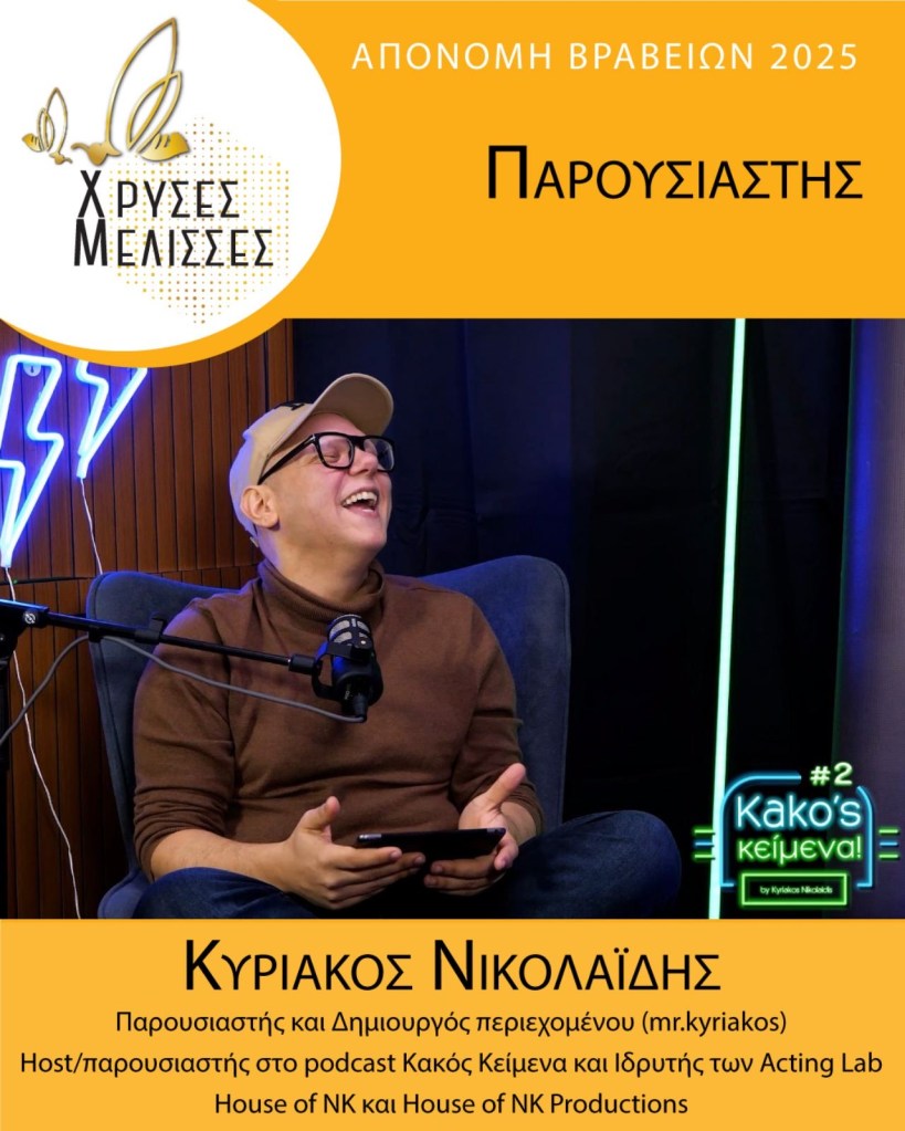 Την παρουσίαση της εκδήλωσης έχει ο Κυριάκος Νικολαΐδης,παρουσιαστής και δημιουργός περιεχομένου (mr.kyriakos)– Host/παρουσιαστής στο podcast Κακός Κείμενα και ιδρυτής των Acting Lab House of NK και House of NK Productions.