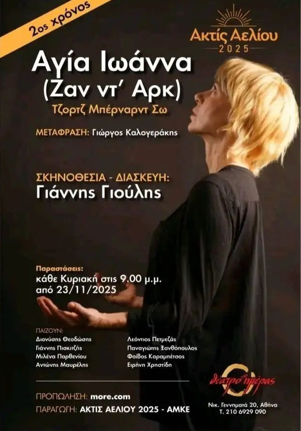 Η ΑΚΤΙΣ ΑΕΛΙΟΥ 2025 μετά την περσυνή τεράστια επιτυχία της με το θεατρικό έργο ΑΓΙΑ ΙΩΑΝΝΑ (Ζαν ντ’ Αρκ) του Τζορτζ Μπέρναρντ Σω στην μεγάλη σκηνή στο ΘΕΑΤΡΟ ΤΗΣ ΗΜΕΡΑΣ Ν. Γεννηματά 20 στους Αμπελόκηπους το παρουσιάζει φέτος για δεύτερη χρονιά κάθε Κυριακή μέχρι την Κυριακή των Βαίων στις 9.00 μ.μ στο ίδιο θέατρο .Πρόκειται για ένα έργο που έχει πάρα πολλά χρόνια να παρουσιαστεί στην αθηναϊκή σκηνή κουβαλώντας στην φαρέτρα του ερμηνείες για τον σημαντικό και σπάνιο ρόλο της Αγίας Ιωάννας μεταξύ άλλων από τις πρωταγωνίστριες Αλίκη Νορ, Αντιγόνη Βαλάκου και Βάσω Μανωλίδου. Υπόθεση :Είναι η ιστορία της Ζαν ντ’ Αρκ, εθνικής ηρωίδας και προστάτιδας της Γαλλίας. Η αινιγματική μορφή της νεαρής χωριατοπούλας από το Ντομρεμύ, που έσωσε στις αρχές του 15ου αιώνα τη Γαλλία από την αγγλική εισβολή, έχει εμπνεύσει ιστορικούς, ποιητές και καλλιτέχνες. Άραγε ήταν πλάσμα προικισμένο με ασυνήθιστες ιδιότητες ή όργανο που το χρησιμοποίησαν απρόσωπες κοινωνικά δυνάμεις, για να εξυπηρετήσουν τους σκοπούς τους; Ήταν ηρωίδα ή μια τυχαία εξημμένη κεφαλή που την εξιδανικεύει ο θρύλος; Άκουσε πραγματικά φωνές ή έλεγε ψέματα, για να πείσει πως ήταν επιφορτισμένη με θεία εντολή; Η μοναδική καλλιτεχνική δικαίωση της ιστορίας της αναμφίβολα ήρθε από τον Ιρλανδό νομπελίστα ρασιοναλιστή, άθρησκο Τζορτζ Μπέρναρντ Σω που στη γραφή του δείχνει να την πιστεύει. Το πιο κορυφαίο έργο του που πρωτοπαίχτηκε το 1923 υποστηρίζει πως οι νέες ιδέες έρχονται στον κόσμο με συνειδητή εκλογίκευση. Η ‘’Αγία Ιωάννα’’ αντιπροσωπεύει την ελεύθερη συνείδηση, τις καινούργιες δυνάμεις που θα οδηγούσαν στον καινούργιο κόσμο, ενάντια στις αντιλήψεις του Μεσαίωνα. Ήρθε σε σύγκρουση με τους παλιούς, ισχυρότατους θεσμούς. Έτσι διαγράφεται το ιδεολογικό υπόστρωμα στο κείμενο. Παρακολουθούμε τη βάση για την αντικειμενική στάση του δραματουργού που εμπεριέχει το ηθικό μεγαλείο. Θεατρικά, το δράμα ξεπερνάει το κοινό μέτρο της δραματουργίας. Ο συγγραφέας σατιρίζει αλλά δεν διασύρει τα πρόσωπα. Ειρωνεύεται την υποκρισία τους. Ξεσκεπάζει τα ελατήριά τους. Αγγίζει την ηρωίδα δίχως αισθηματολογία και λυρική διάθεση, με μια οικειότητα που τη φέρνει κοντά μας. Το μεταφυσικό στοιχείο μιλάει τη γλώσσα του ενστίκτου. Υπάρχει στον χαρακτήρα της κάτι το αγγελικό. Δεν είναι απάνθρωπα ηρωική. Το δραματικό χρονικό του Μπέρναρντ Σω μένει πάντα αληθινό, άρτιο, πειστικό και ζωντανό.
