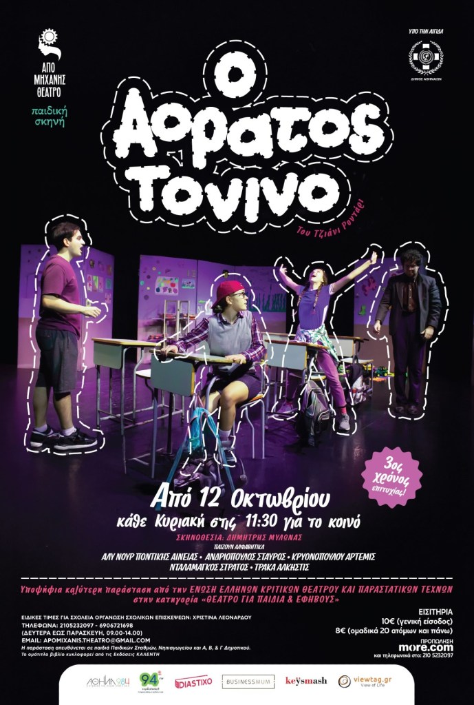 Η παράσταση «Ο Αόρατος Τονίνο», βασισμένη στο ομότιτλο βιβλίο του Τζάνι Ροντάρι και σκηνοθεσία Δημήτρη Μυλωνά που παρουσιάστηκε με μεγάλη επιτυχία για τρεις συνεχόμενες σεζόν στην ΠΑΙΔΙΚΗ ΣΚΗΝΗ του «Από Μηχανής» Θεάτρου τόσο για το κοινό όσο και για παιδικούς σταθμούς, νηπιαγωγεία και δημοτικά σχολεία της Αττικής, ολοκληρώνει στις 5 Απριλίου 2026 το ταξίδι της.