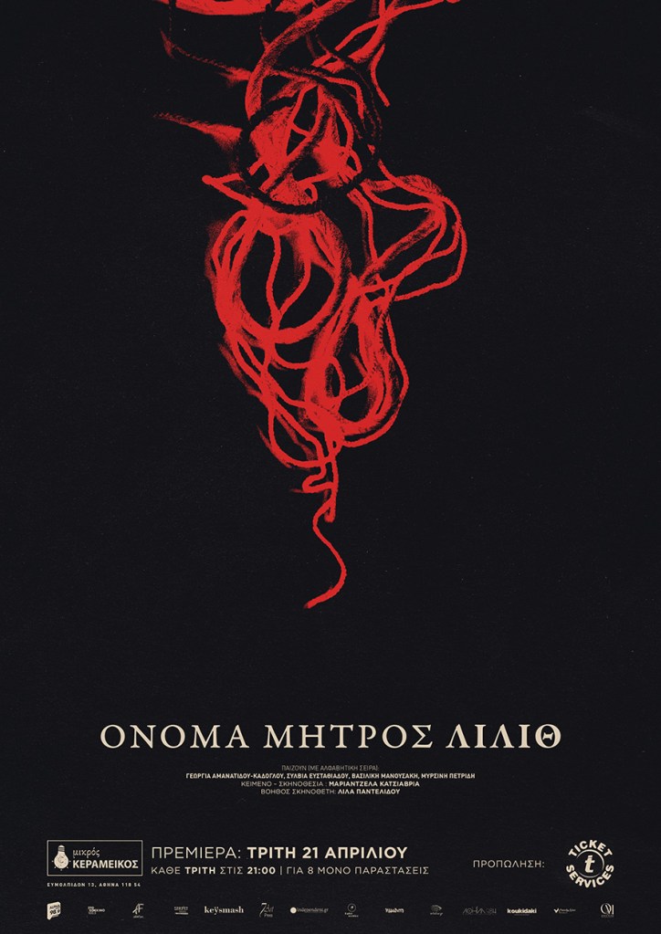 Η παράσταση «Όνομα μητρός Λίλιθ» σε πρωτότυπο κείμενο της Μαριάντζελας Κατσιαβριά βασίζεται στον αρχαίο μύθο των μοιρών. Συγκεκριμένα σε μια παραλλαγή του Πίνδαρου σύμφωνα με την οποία υπάρχει και μια τέταρτη αδερφή-μοίρα, η Τύχη. Οι τέσσερις μοίρες δουλεύουν ασταμάτητα καθορίζοντας τις ζωές και τους θανάτους. Αγέρωχες και κυνικές συνεχίζουν να κινούν και να κόβουν το νήμα τους ό,τι κι αν συμβεί. Η Πανδώρα, η Ευρυδίκη, η Κασσάνδρα και η Μέδουσα παρουσιάζονται ως τραγικές φιγούρες που δε μπόρεσαν να ξεφύγουν από τη μοίρα τους. Το νήμα δε σταματά να κόβει ζωές γυναικών. Όσο όμως οι γυναικοκτονίες πληθαίνουν οι μοίρες καταλαβαίνουν πως κάτι πρέπει να αλλάξει.