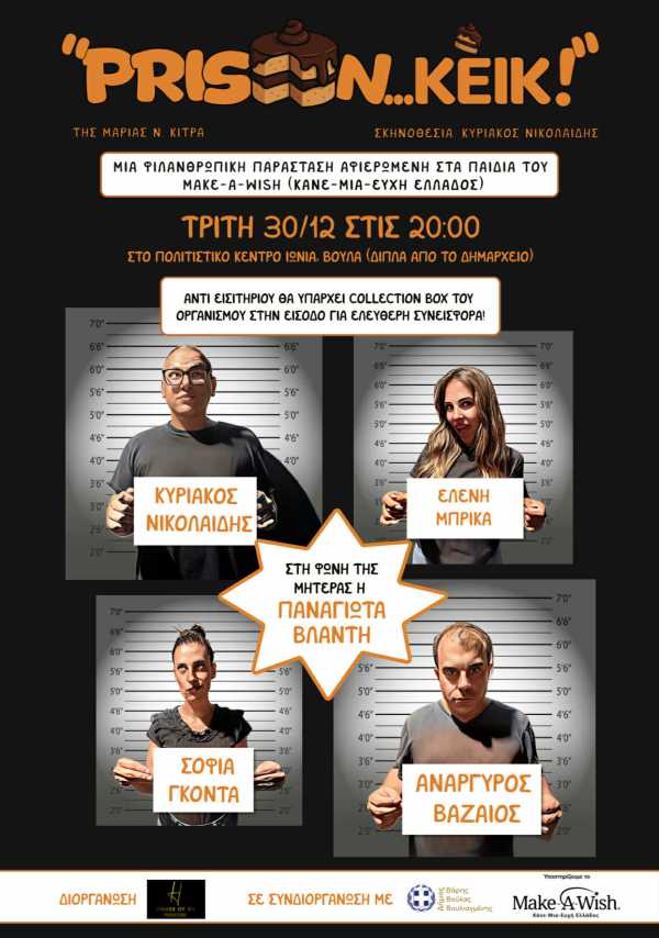 Φιλανθρωπική Παράσταση “PRISON… ΚΕΪΚ!” Αφιερωμένη στα παιδιά του Make–A–Wish (Κάνε-Μια-Ευχή Ελλάδος) Μία παράσταση γεμάτη γέλιο, ανατροπές και… πολύ κέικ επιστρέφει, αυτή τη φορά με τον πιο όμορφο σκοπό: να στηρίξει τις ευχές των παιδιών του Make–A–Wish (Κάνε-Μια-Ευχή Ελλάδος). Η θεατρική κωμωδία “Prison… Κέικ!”, της Μαρίας Ν. Κίτρα και σε σκηνοθεσία Κυριάκου Νικολαΐδη, παρουσιάζεται την Τρίτη... Continue Reading →