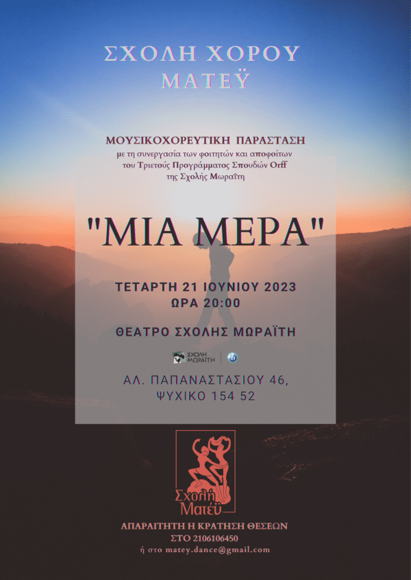 85 Χρόνια Σχολή Χορού Ματέϋ | Επετειακή παράστασηΕίσοδος με πρόσκληση Πώς μοιάζει, άραγε, το 24ωρο ενός μαθητή που λατρεύει τον χορό και τη μουσική; Σ’ αυτό το ερώτημα απαντά, με ονειρική αλλά και ρεαλιστική διάθεση, η παράσταση «Μια Μέρα». Μια σύμπραξη της Σχολής Χορού Ματέϋ, η οποία συμπληρώνει φέτος 85 χρόνια από τη λειτουργία της,... Continue Reading →