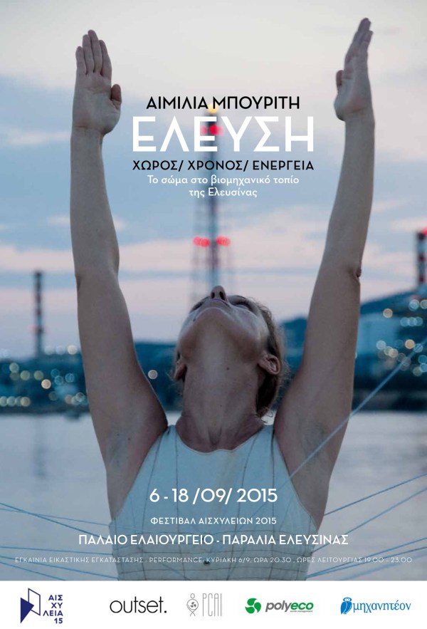 ΦΕΣΤΙΒΑΛ ΑΙΣΧΥΛΕΙΩΝ 2015 Αιμιλία Μπουρίτη Έλευση | Χώρος Χρόνος Ενέργεια Το σώμα στο βιομηχανικό τοπίο της Ελευσίνας 6 - 18 /09 /2015 Εγκαίνια εικαστικού έργου & performance Κυριακή 6/9, ώρα 20.30 Παλαιό Ελαιουργείο - Παραλία Ελευσίνας Ώρες λειτουργίας της έκθεσης 19.00 – 23.00 Η Ελευσίνα, ένας τόπος που τον χαρακτηρίζει μία σημαντική αρχαία ιστορία, ταυτόχρονα... Continue Reading →