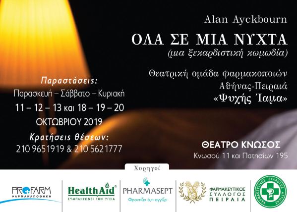 Η Θεατρική Ομάδα Φαρμακοποιών Αθήνας – Πειραιά «ΨΥΧΗΣ ΙΑΜΑ» συμπληρώνει φέτος δέκα χρόνια δραστηριοτήτων και το γιορτάζει με την παρουσίαση της «πιο ξεκαρδιστικής κωμωδίας» του γνωστού σύγχρονου Άγγλου θεατρικού συγγραφέα Alan Ayckbourn «Όλα σε μια νύχτα» (διασκευή – μετάφραση: Γιώργος Κιμούλης). Για τις ανάγκες της παράστασης, η Ομάδα «μετακομίζει» και πάλι στο Θέατρο «Κνωσός» (Κνωσού... Continue Reading →