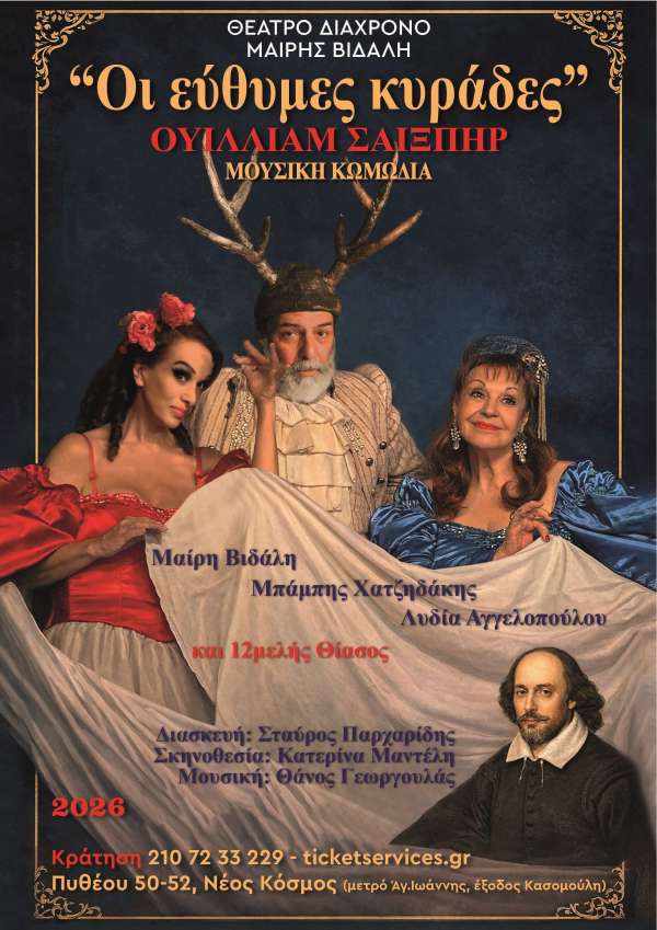 «Οι Εύθυμες Κυράδες» Μουσική κωμωδία ΟυίλλιαμΣαίξπηρ Διασκευή: Σταύρος Παρχαρίδης Σκηνοθεσία: Κατερίνα Μαντέλη Μουσική: Θάνος Γεωργουλάς Στο ΔΙΑΧΡΟΝΟ ΘΕΑΤΡΟ ΜΑΙΡΗΣ ΒΙΔΑΛΗ Από το Σάββατο 31 Ιανουαρίου 2026 Σαίξπηρ ερμηνεύει για 4η φορά η Μαίρη Βιδάλη και αυτή την φορά στο θέατρο της Στον κεντρικό ρόλο του Φάλσταφ ο Μπάμπης Χατζηδάκης Μαζί τους η πρωταγωνίστρια της οπερέτας... Continue Reading →