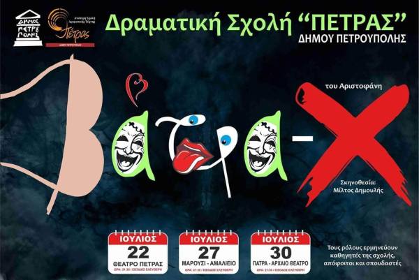 Η Δραματική Σχολή Πέτρας του Δήμου Πετρούπολης ανεβάζει τους “Βατράχους” του Αριστοφάνη σε σκηνοθεσία Μίλτου Δημουλή. Η πρεμιέρα της παράστασης θα γίνει στο Θέατρο Πέτρας στις 22 Ιουλίου 2018 ώρα 21:30. Τους ρόλους ερμηνεύουν, καθηγητές της σχολής, απόφοιτοι και σπουδαστές. Πρόγραμμα παραστάσεων: 22/07/2018:Θέατρο Πέτρας (Σκηνή Πήτερ Μπρουκ) 27/07/2018:Δήμος Αμαρουσίου (Αμαλίειο) 30/07/2018:Δήμος Πάτρας (Αρχαίο Ωδείο) Η... Continue Reading →