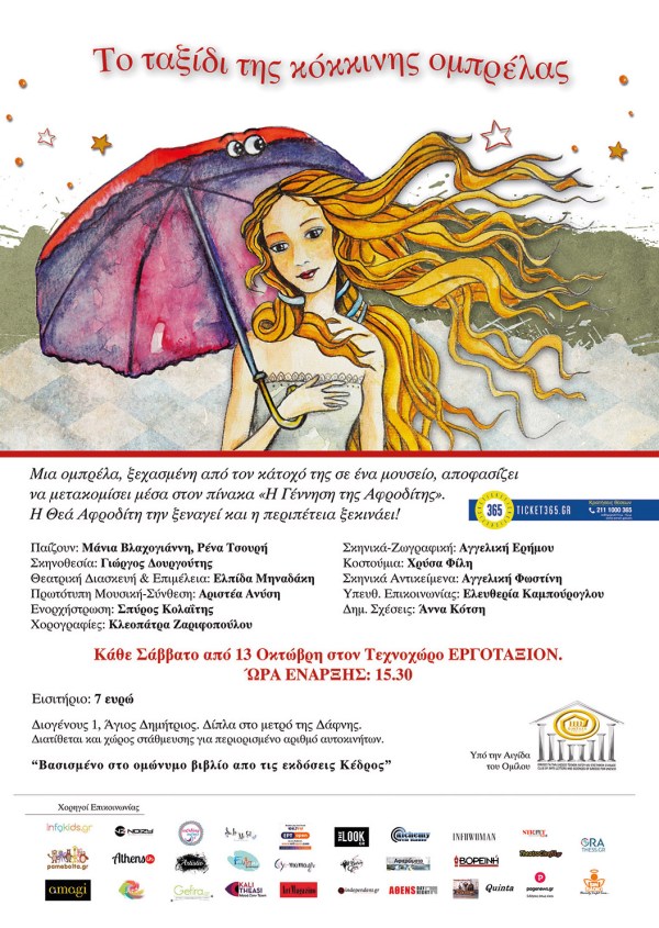 ΤΟ ΤΑΞΙΔΙ ΤΗΣ ΚΟΚΚΙΝΗΣ ΟΜΠΡΕΛΑΣ! ΜΙΑ ΥΠΕΡΟΧΗ ΠΑΙΔΙΚΗ ΠΑΡΑΣΤΑΣΗ ΓΙΑ ΤΗΝ ΑΓΑΠΗ, ΤΗΝ ΤΕΧΝΗ, ΤΟΝ ΖΩΓΡΑΦΟ ΜΠΟΤΙΤΣΕΛΙ ΚΑΙ ΤΗ ΘΕΑ ΑΦΡΟΔΙΤΗ! Μια κόκκινη ομπρέλα, ξεχασμένη από τον κάτοχό της στην ομπρελοθήκη της Πινακοθήκης Ουφίτσι, ανακαλύπτει τη μαγεία των πιο διάσημων έργων ζωγραφικής στον κόσμο. Γνωρίζει από κοντά την Αφροδίτη, την Ώρα, τους Ανέμους, αλλά και... Continue Reading →