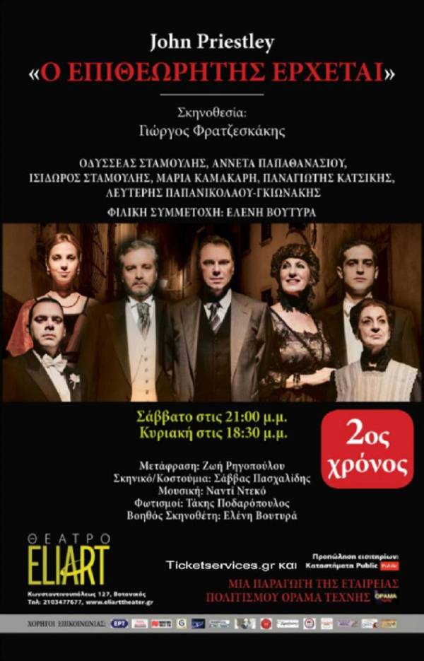 Η Εταιρεία Πολιτισμού «ΟΡΑΜΑ ΤΕΧΝΗΣ» συνεχίζει τις παραστάσεις του διάσημου έργου του John Priestley «O Eπιθεωρητής έρχεται» στο θέατρο ELIART Kωνσταντινουπόλεως 127 στο Γκάζι και τη νέα χρονιά για περιορισμένο αριθμό παραστάσεων. Όσοι δεν πήγατε να το δείτε ακόμα μπορείτε να το παρακολουθήσετε κάθε Σάββατο στις 9 το βράδυ και Κυριακή στις 18.30 το απόγευμα.... Continue Reading →